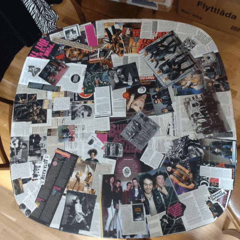 Den här veckan ska vi associera fritt till denna bild, som egentligen är en massa bilder och urklipp som ligger på ett bord. Jag vet, den är lite suddig, men ni kan följa mina associationer också 🙂 Om du har egna låtar på temat, skicka dem gärna till mig så lägger jag till i spellistan här
